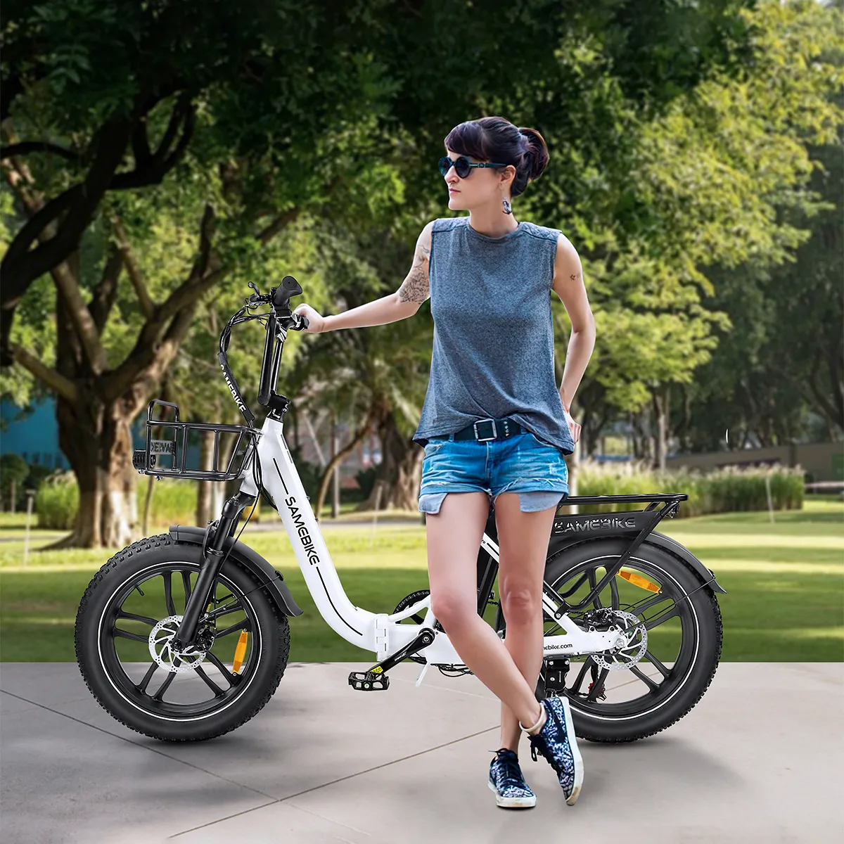 La SAMEBIKE C05 Pro es tu compañera versátil definitiva. Con un diseño de cuadro abierto (step-through) muy accesible, neumáticos anchos todoterreno y prácticos soportes de carga, hace que ir de compras, ir al trabajo y buscar aventuras sea un proceso cómodo y sin esfuerzo.